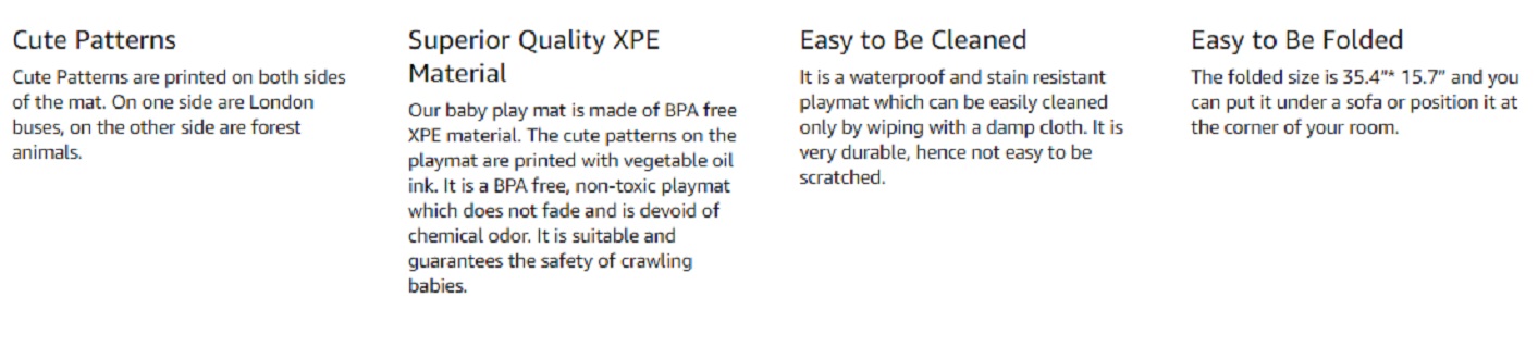 - Superior Quality XPE Material: Our baby play mat is made of BPA free XPE material. The cute patterns on playmat are printed with vegetable oil ink. The product is characterized by the following features; BPA free, non-toxic, no-fading, no chemical odor, comfortable and safe for baby crawling. This is a toddler-friendly mat that guarantees the safety of your baby.