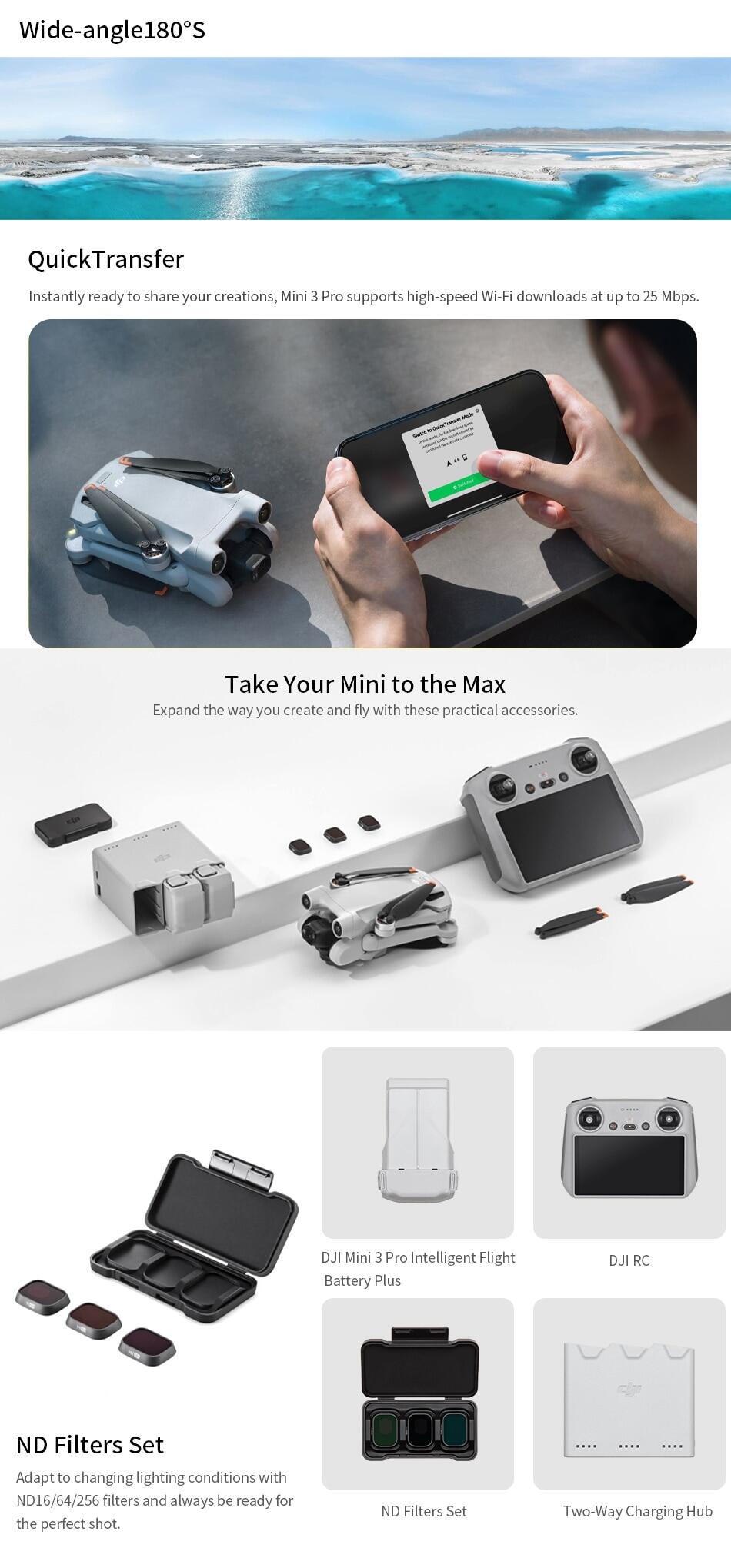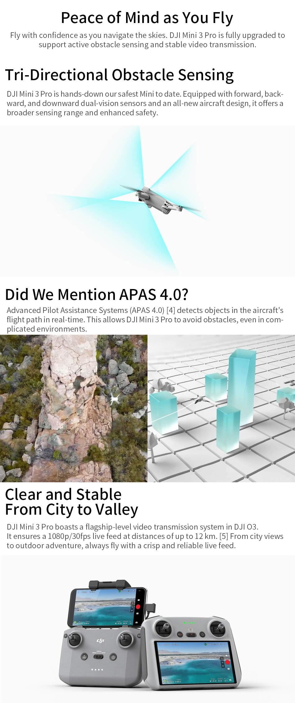 Specifically: Inheriting the 249 g light and compact body, DJI Mini 3 Pro comes with a 1/1.3-inch image sensor that supports native HDR. It supports three-directional obstacle sensing and the newly upgraded APAS 4.0 (Advanced Pilot Assistance Systems). It supports DJI O3 FHD digital video transmission, ensuring a stable live feed at distances of up to 12 km. DJI Mini 3 Pro also supports intelligent features like FocusTrack, True Vertical Shooting, Timelapse, MasterShots, and High-Speed QuickTransfer.