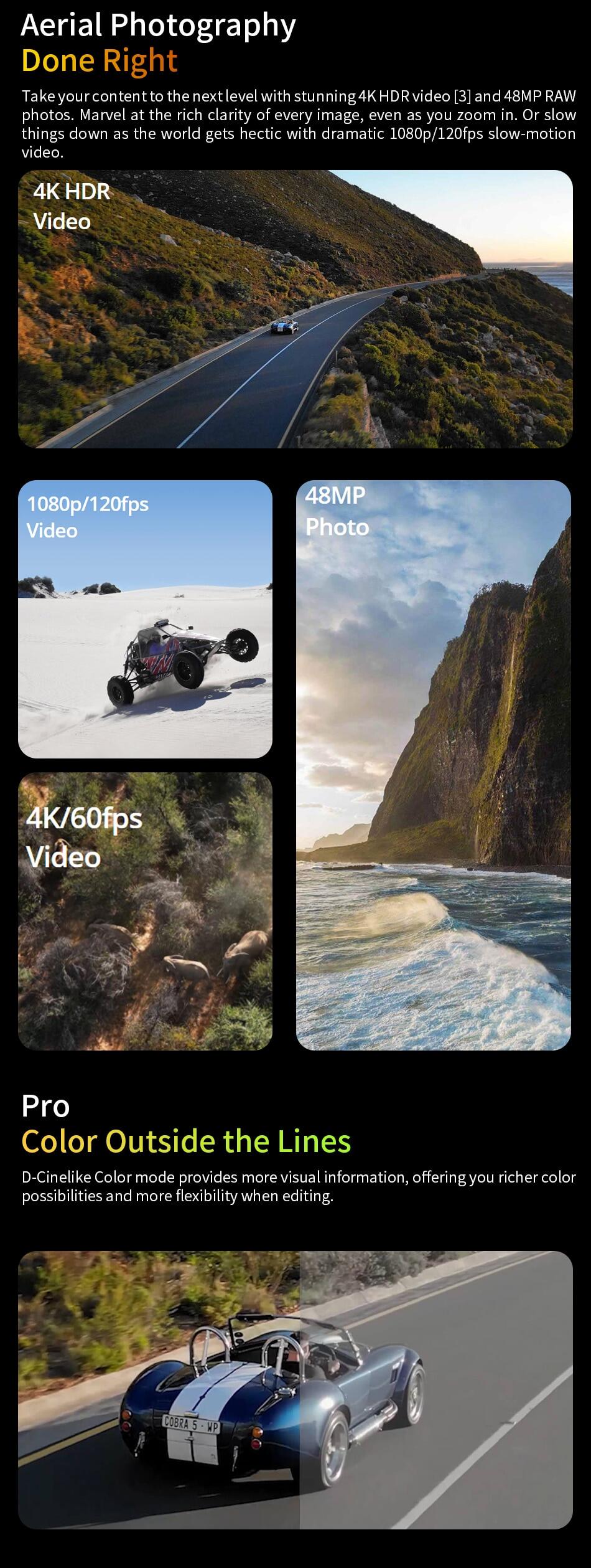 3. True Vertical Shooting and expanded axes: The new design allows users to get portrait shots without the need for digital cropping. Fewer gimbal limits mean more shooting angles and added creative freedom. During high-speed flight, the aircraft angle also has less restrictions on the gimbal and the shooting angle.